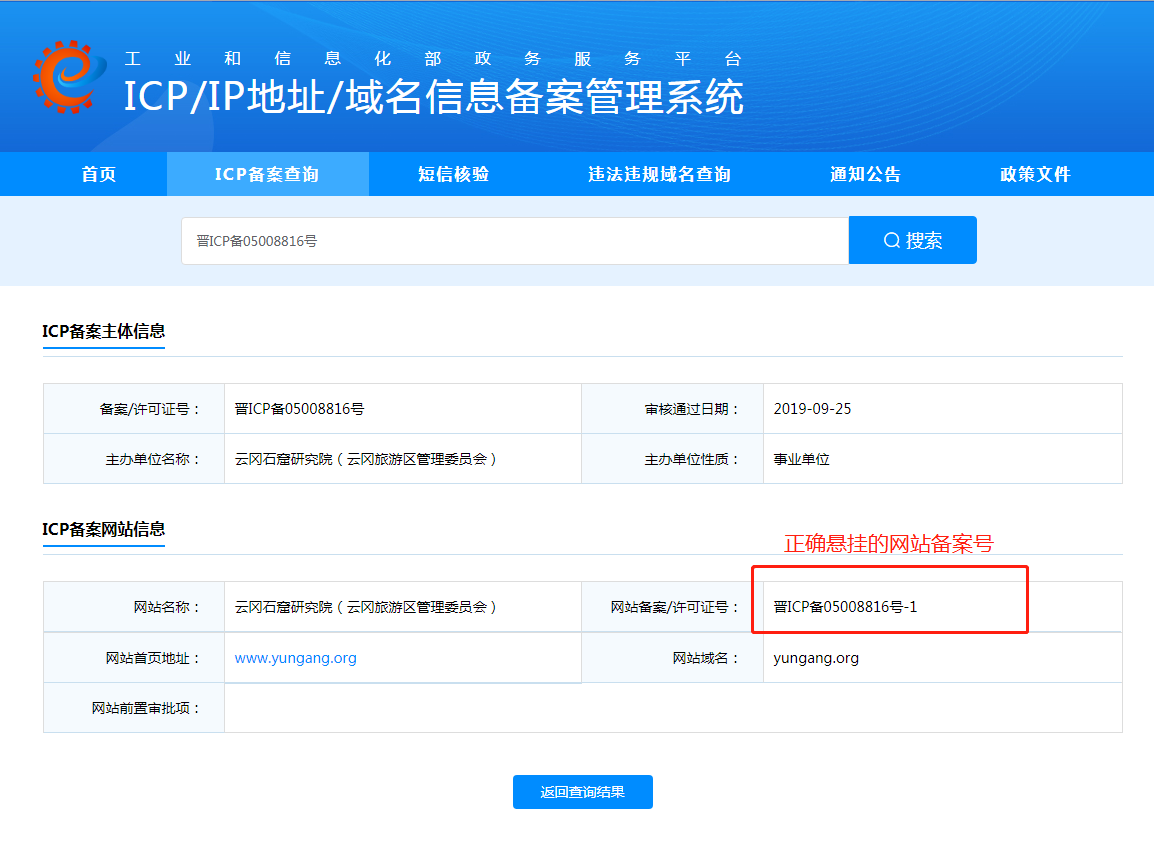 根據國家規定和管理要求,各網站主辦者在2021年1月20日(各接入商要求整改的時間不完全一致,大體在2021年1月下旬)前完成網站主頁底部網站備案號的懸掛和鏈接工作,特別提示:必須懸掛網站備案號,例如:晉ICP備****號-1;不可以懸掛主體備案號,例如:晉ICP備****號。鏈接須指向工信部備案管理系統網址(https://beian.miit.gov.cn)。若未及時整改,根據相關規定將面臨省通信管理局責令整改、并處五千元以上一萬元以下罰款的處罰,或應相關監管部門要求,網站有被關閉、備案被取消接入或網站備案被注銷的風險。